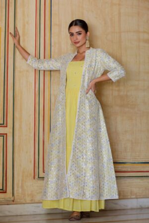 Quick viewSelect options This product has multiple variants. The options may be chosen on the product page Add to wishlistCotton Lurex Yellow Anarkali Dress With Full Sequence Work Jacket