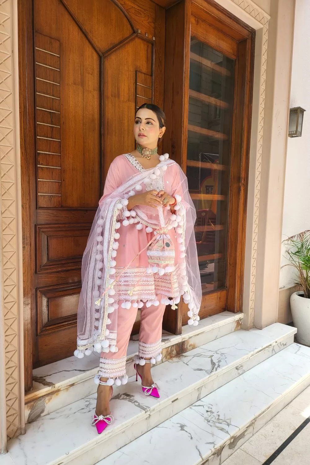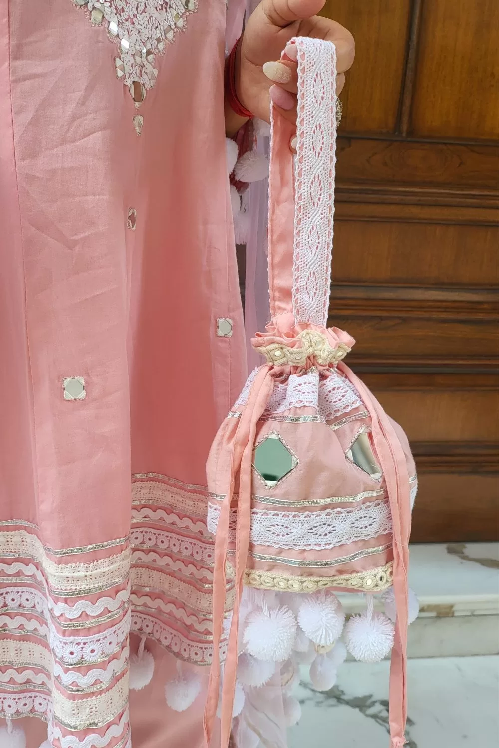Premium Luxury Cotton Heavy Pom Pom Suit Set With Heavy Potli