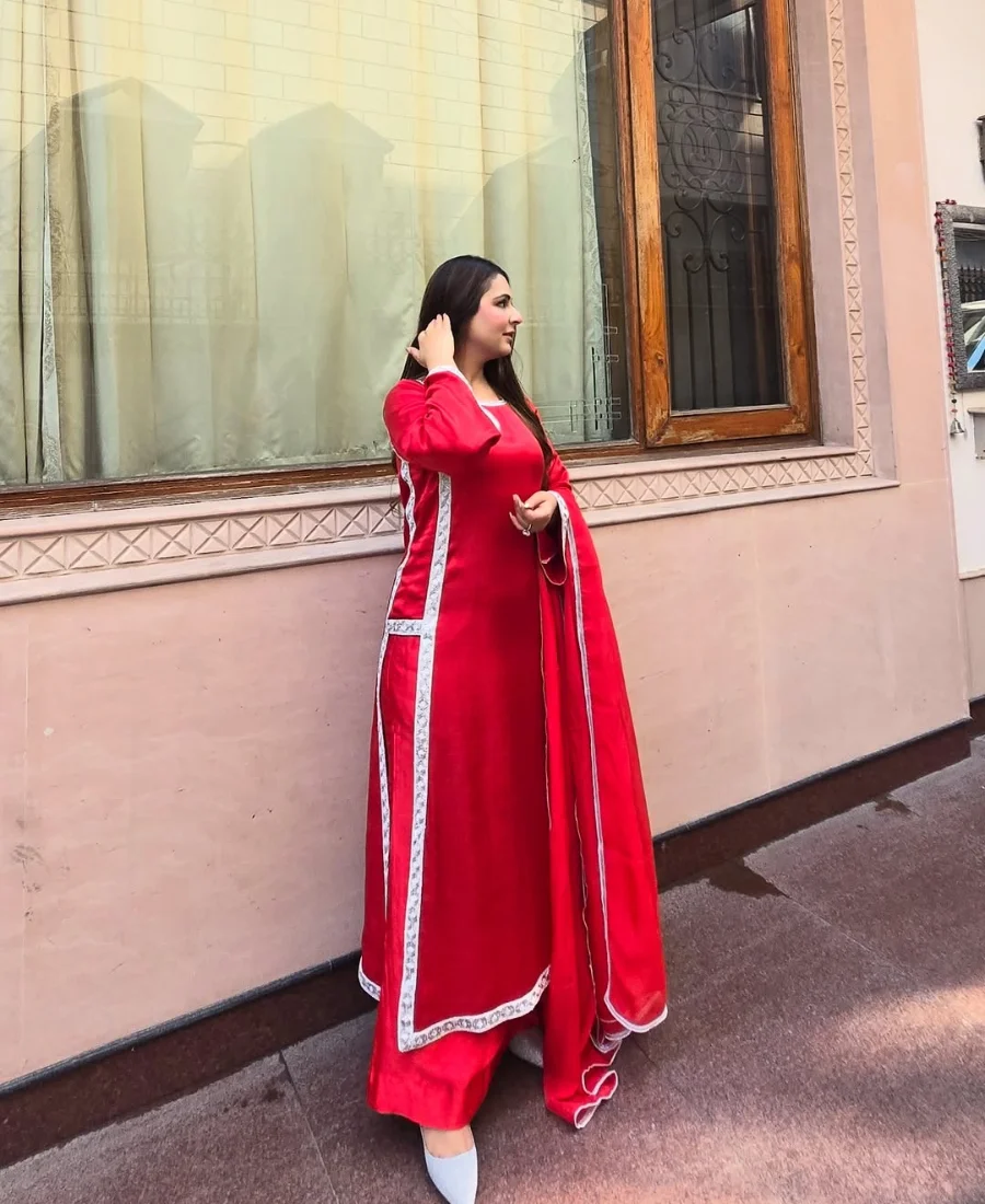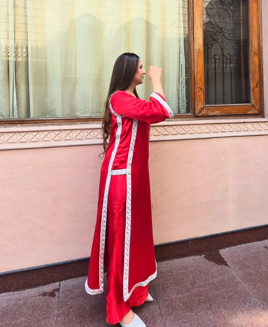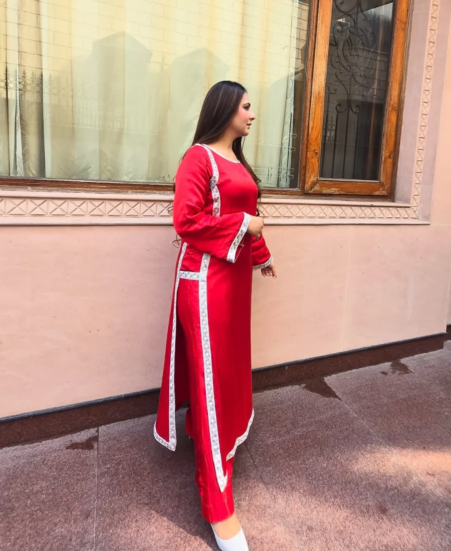 Turn heads with effortless elegance in the Crimson Luxe Designer Suit from Ireshh, crafted for women who appreciate bold color with refined simplicity. Made from premium modal crepe silk, this luxury fabric offers a silky-smooth touch, soft sheen, and fluid drape that instantly elevates your look.