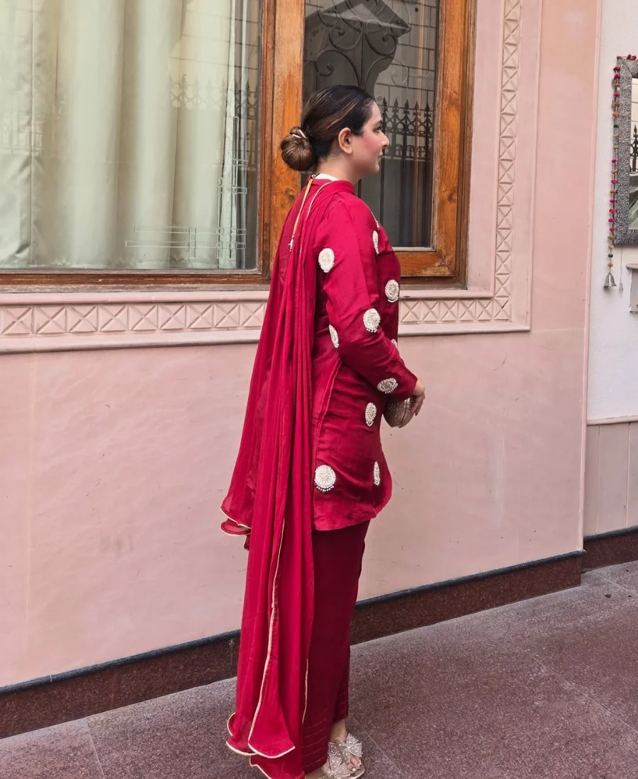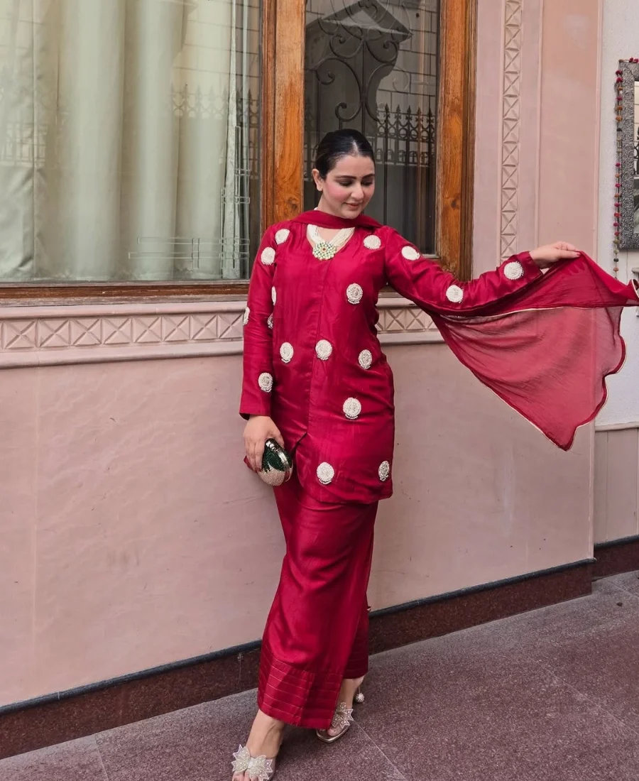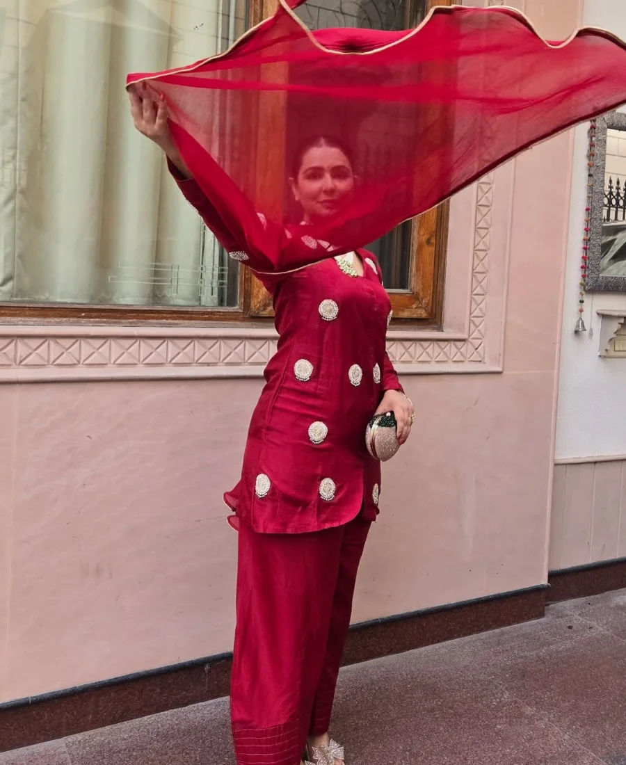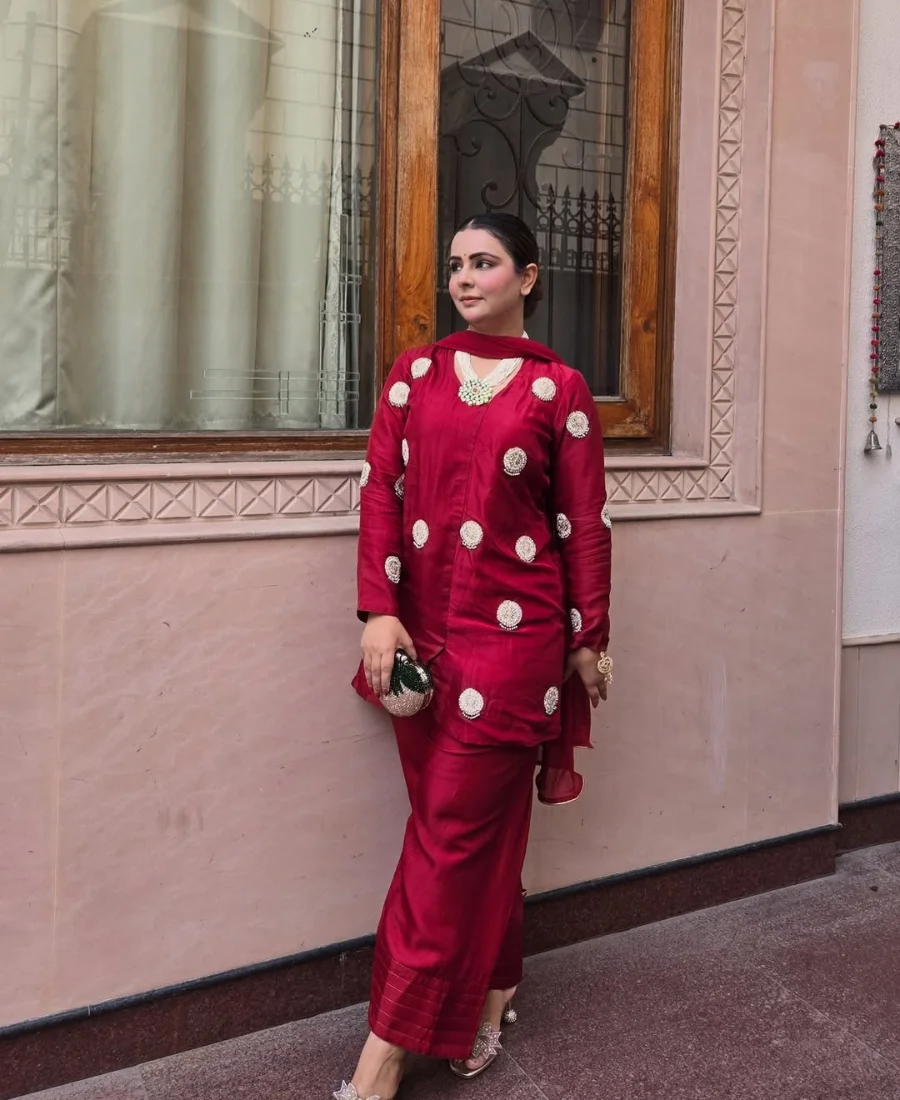 What truly sets this outfit apart is the intricate handwork detailing — carefully placed embellishments that add depth, craftsmanship, and exclusivity to the design. The bold ruby red tone enhances its festive appeal, while the elegant silhouette keeps the overall look refined and powerful.