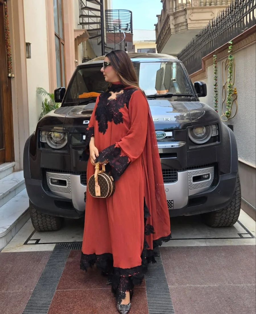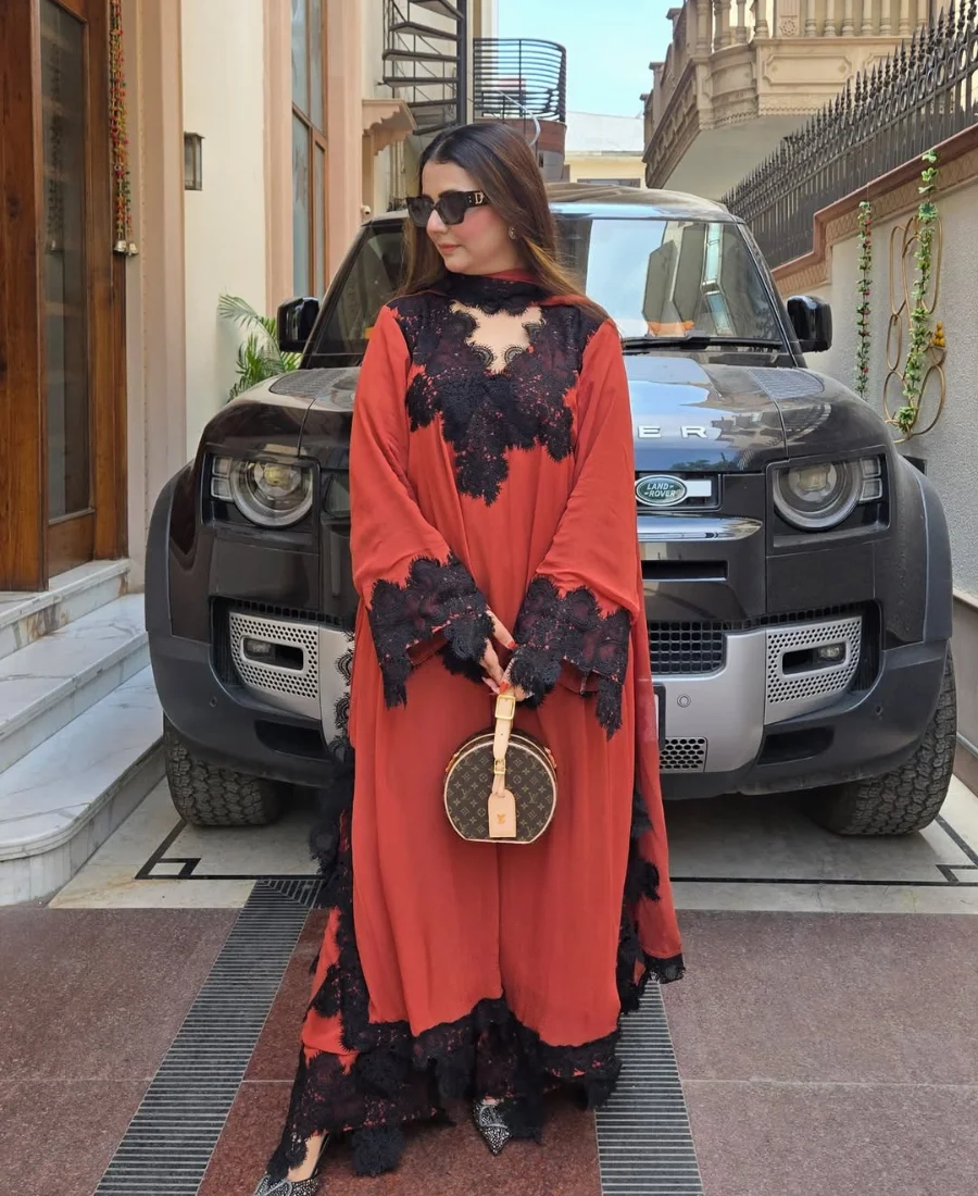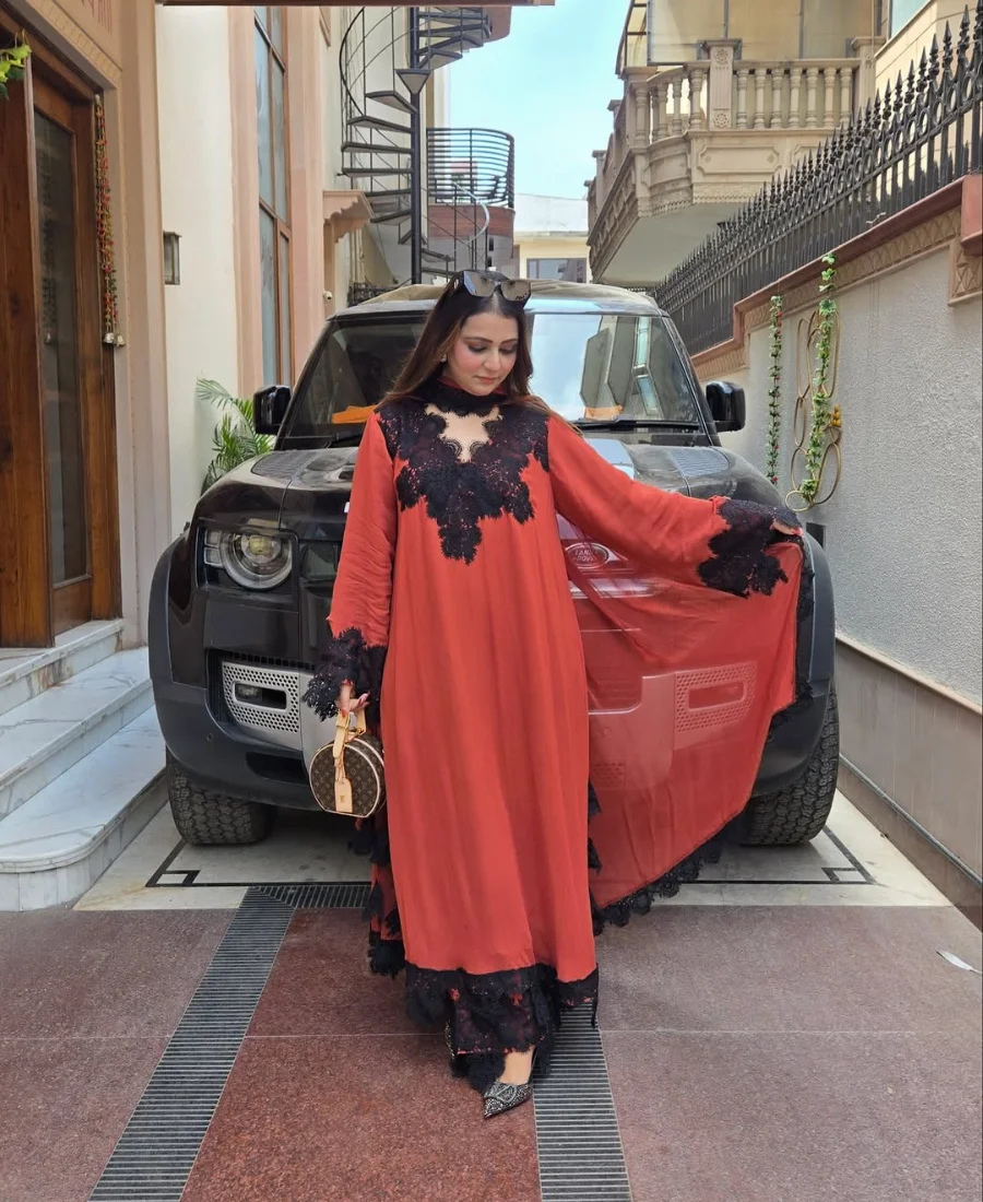 The rich rust tone is elevated with striking black lace embellishments across the neckline, sleeves, and hem, creating a dramatic contrast that instantly sets this piece apart. The flowy silhouette adds volume and movement, giving it a luxurious, high-fashion appeal rather than a typical structured suit.