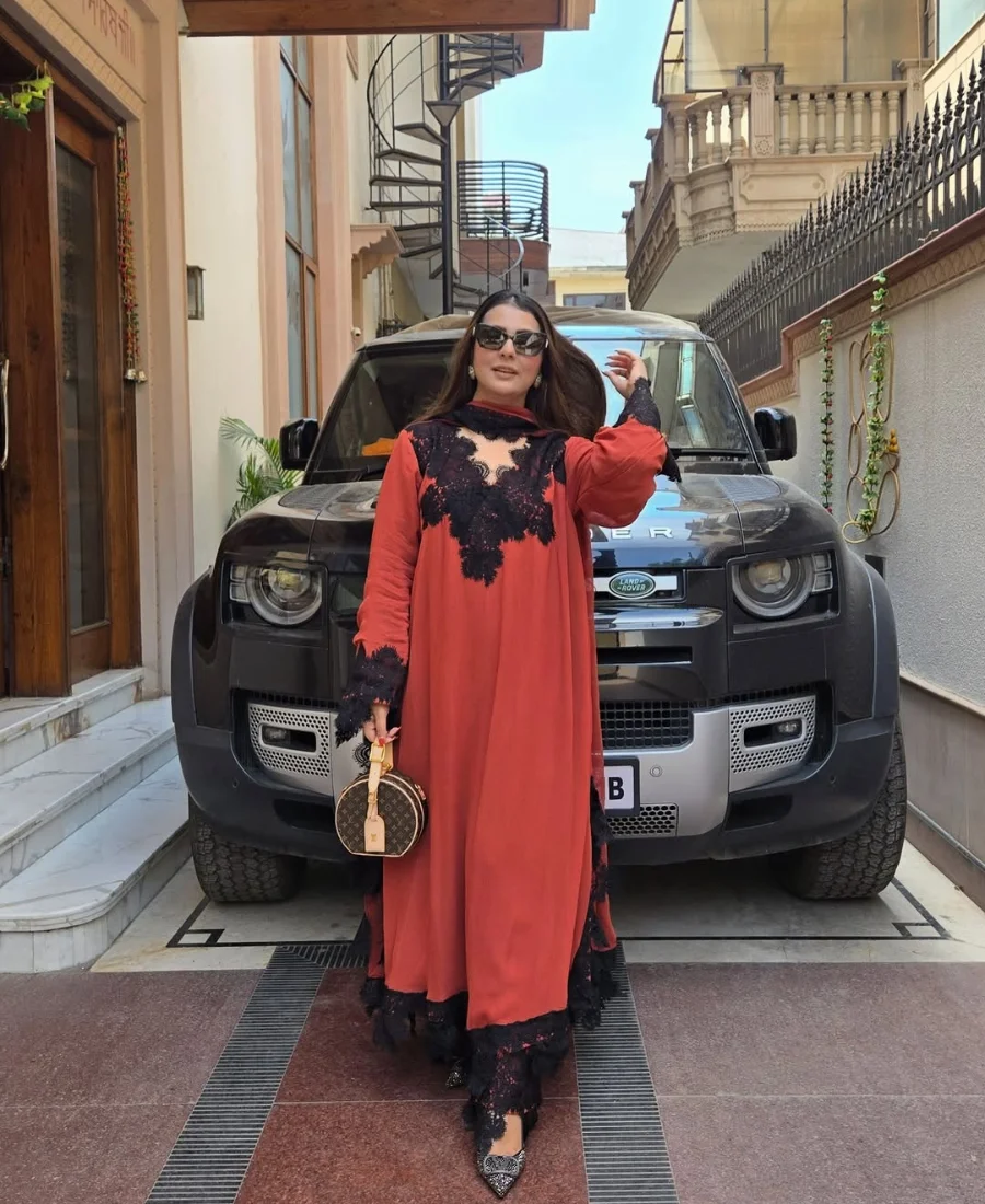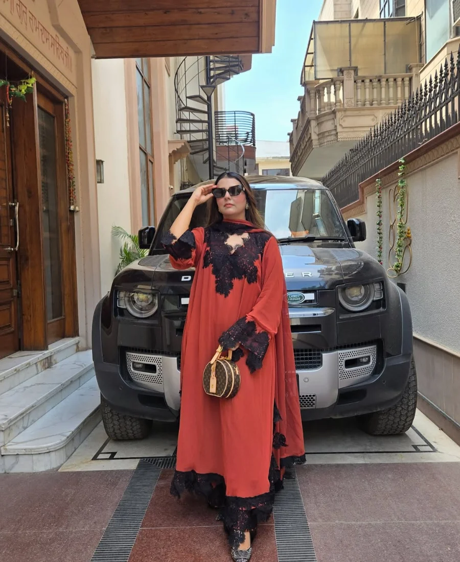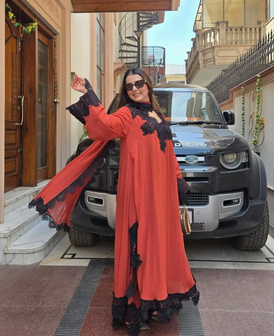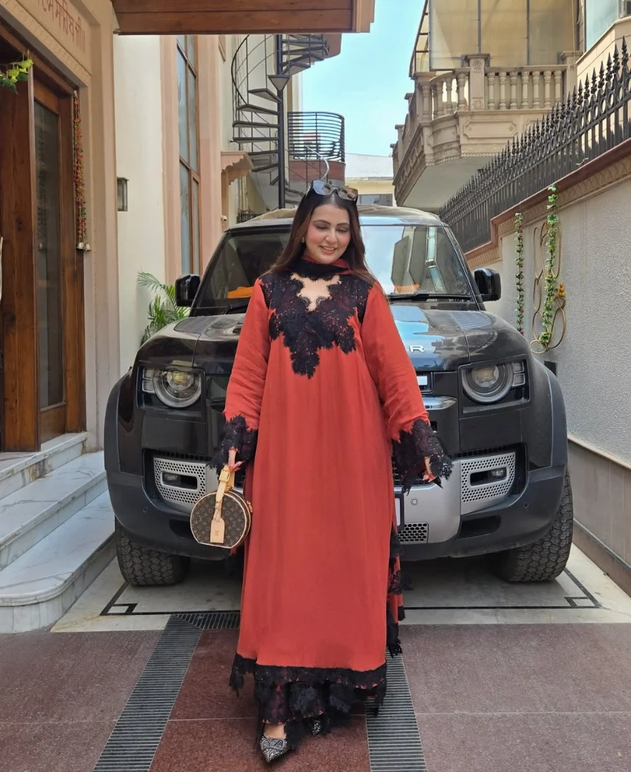 The rich rust tone is elevated with striking black lace embellishments across the neckline, sleeves, and hem, creating a dramatic contrast that instantly sets this piece apart. The flowy silhouette adds volume and movement, giving it a luxurious, high-fashion appeal rather than a typical structured suit.