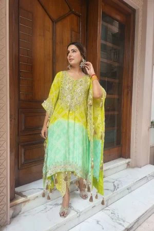 ₹3,995.00Original price was: ₹3,995.00.₹3,495.00Current price is: ₹3,495.00.Pure Crepe Cut Dana Hand Embroidery Kaftaan Set -