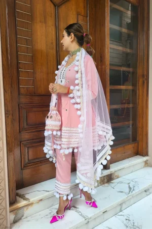 ₹5,000.00Original price was: ₹5,000.00.₹4,695.00Current price is: ₹4,695.00.Premium Luxury Cotton Heavy Pom Pom Suit Set With Heavy Potli -