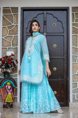 ₹9,195.00Original price was: ₹9,195.00.₹6,695.00Current price is: ₹6,695.00.Silk Fabric Kashmiri Hand Work Heavy Sharara Set -