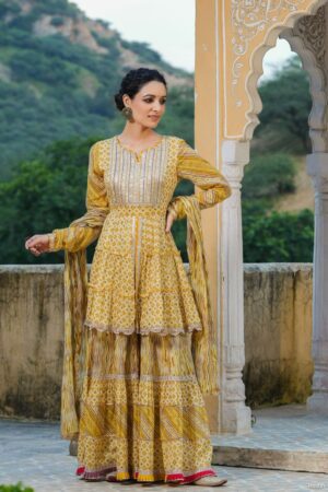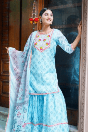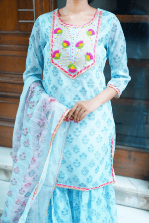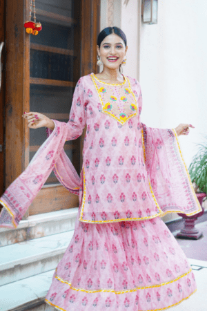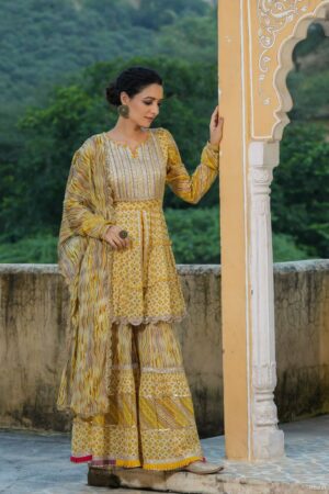 ₹6,495.00Original price was: ₹6,495.00.₹4,495.00Current price is: ₹4,495.00.Pure mul chanderi sharara suit set -