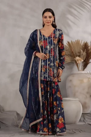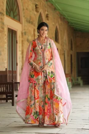 ₹7,995.00Original price was: ₹7,995.00.₹4,995.00Current price is: ₹4,995.00.Elevate your style with our Pure Muslin Silk Heavy Hand-Embroidered Flowy Sharara Set. -