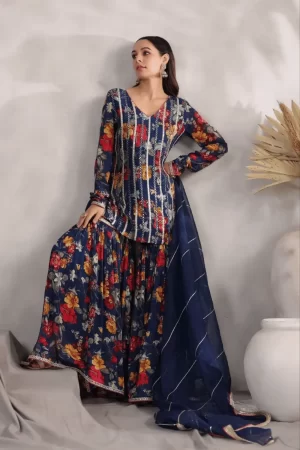 ₹7,995.00Original price was: ₹7,995.00.₹4,995.00Current price is: ₹4,995.00.Elevate your style with our Pure Muslin Silk Heavy Hand-Embroidered Flowy Sharara Set. -