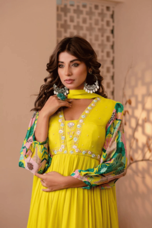 Quick viewSelect options This product has multiple variants. The options may be chosen on the product page Add to wishlistPure Chinon Yellowish Colour all Hand Embroidered Full Flare Anarkali Set